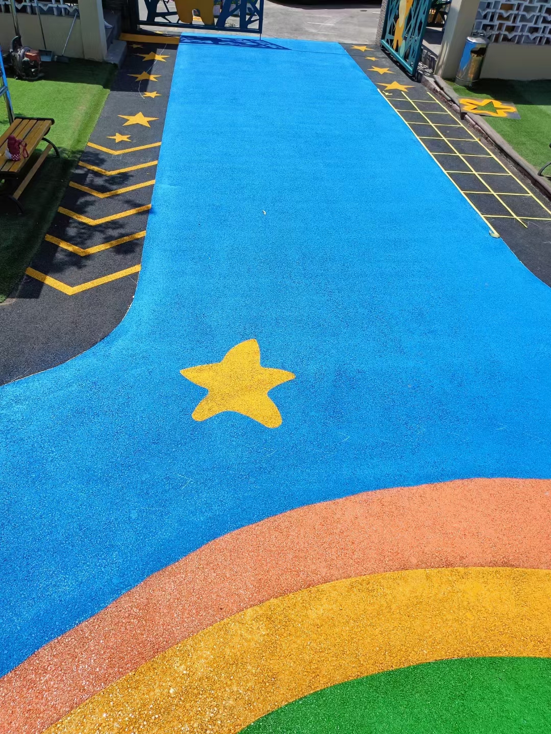 彩色沥青混合料与普通沥青混合料拌和基本相似,但应着重注意以下事项:(1)拌和前,应将搅拌站的拌和缸和沥青输送管道、运输车、施工机械设备等清洗干净。(2)原材料性能应稳定、使生产目标配合比能最大限度的接近设计配合比。(3)由于色粉比重大,在混合料中具有着色、分散、吸附、稳定、增粘的作用,添加时需考虑其对环境的影响,生产前应根据目标配合比计算出每盘混合料色粉用量,用聚乙稀塑料袋装好,拌和中由人工辅助加入。(4)拌和温度应控制在160~170℃,拌和时间比普通沥青混合料多10s,出料应及时检查粒料和颜色是否均匀。——郑州彩色沥青路面摊铺